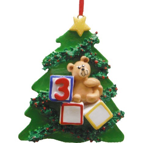 THIS CHRISTMAS ORNAMENT IS OF A CHRISTMAS TREE WITH THREE TOY BLOCKS WITH THE NUMBER 3 ON ONE OF THEM AND A TEDDY BEAR SITTING ONTOP OF ANOTHER WHILE LEANING ON THIS BLOCK. MEASURES APPROX. 4" X 3.25".