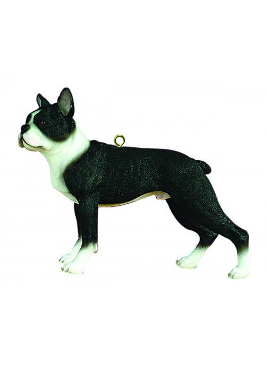 THIS CHRISTMAS ORNAMENT IS MADE OF RESIN AND IS OF A BOSTON TERRIER. MEASURES APPROX. 3" X 4".