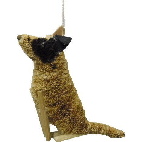 THIS CHRISTMAS ORNAMENT IS MADE OF FIBER FROM THE BURI PALM TREE. IT MEASURES APPROX. 4" X 3" AND IS A BRUSH TERRIER.