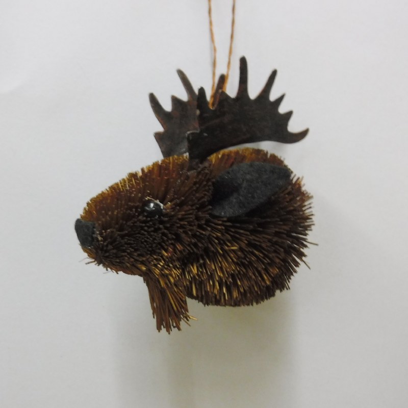 THIS CHRISTMAS ORNAMENT IS MADE OF FIBER FROM THE BURI PALM TREE. IT MEASURES APPROX. 3" X 3" AND IS A BRUSH MOOSE BAUB.