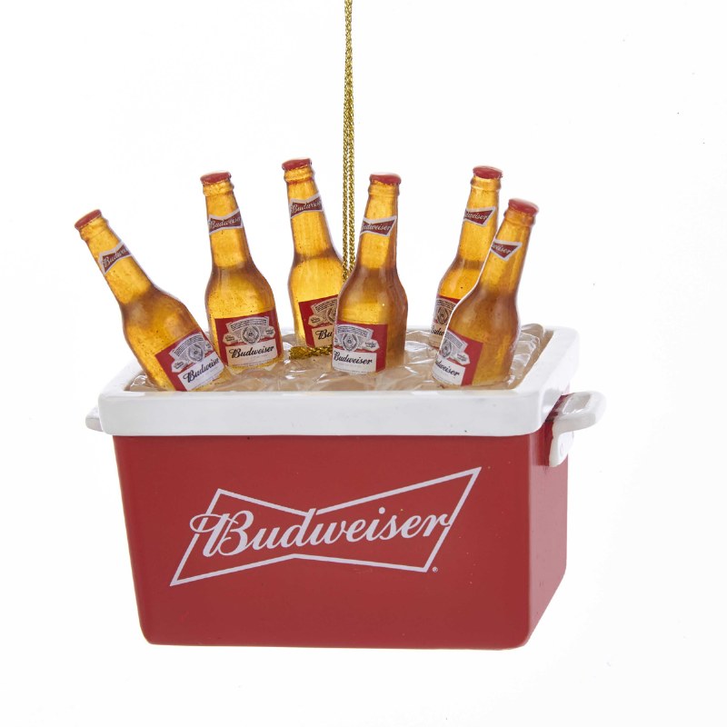 THIS CHRISTMAS ORNAMENT IS MADE OF RESIN AND MEASURES APPROX. 2.5' X 1.5" AND IS OF A BUDWEISER COOLER FULL OF BOTTLES OF BEER.