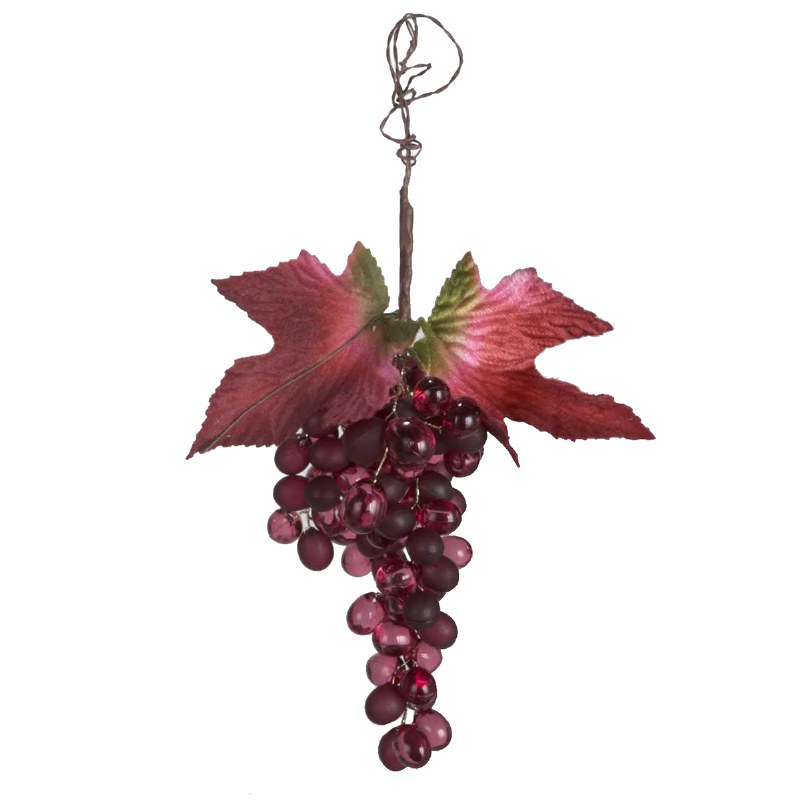 THIS CHRISTMAS ORNAMENT IS A BUNCH OF RED GRAPES HELD TOGEHTER BY WIRE WITH RED AND GREEN LEAVES. MEASURING 6" X 3", AND MADE OUT OF GLASS.