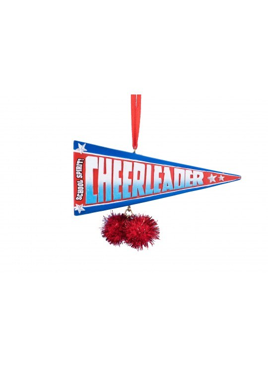 THIS CHRISTMAS ORNAMENT IS MADE OF RESIN AND MEASURES APPROX. 2.25" X 4.5", A SCHOOL SPIRIT PENNENT IN RED WHITE AND BLUE.