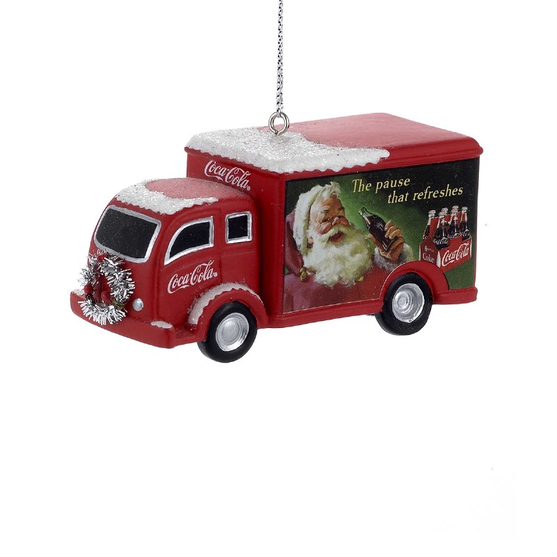 THIS CHRISTMAS ORNAMENT IS APPROX 2" X 3.75" COCA-COLA TRUCK WITH SILVER LETTERING AND PICTURE OF SANTA ON THE SIDE AND "THE PAUSE THAT IS REFRESHING", AND IT IS MADE OF POLY RESIN.