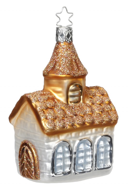THIS CHRISTMAS ORNAMENT IS MADE BY INGE-GLAS AND IS OF A COUNTRY CHURCH. STANDS AT 4" TALL.