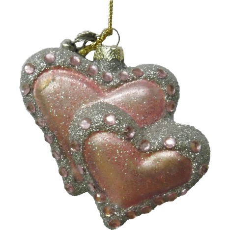 THIS CHRISTMAS ORNAMENT IF MADE OF GLASS AND MEASURES APPROX. 4.5" X 3" AND IS OF TWO PINK HEARTS