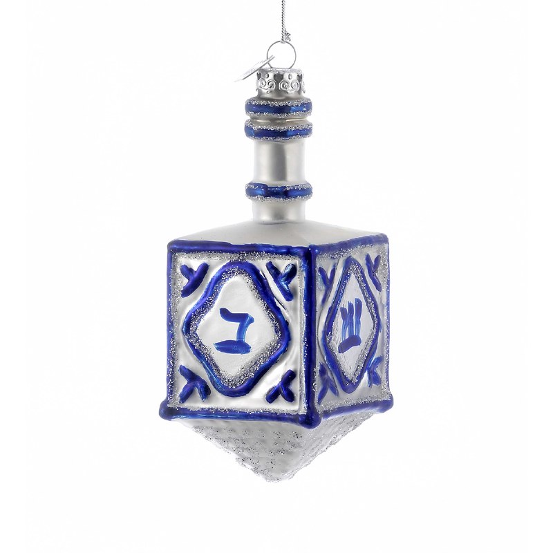 THIS GLASS CHRISTMAS ORNAMENT IS OF A BLUE AND SILVER DREIDEL THAT MEASURES APPROX. 4.75" X 2.75".