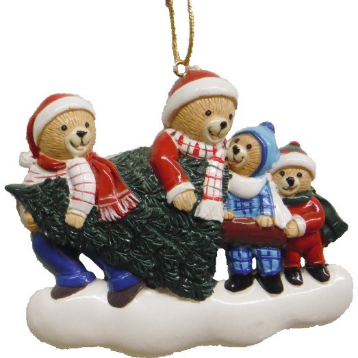 THIS CHRISTMAS ORNAMENT IS MADE OF RESIN AND MEASURES APPROX. 3.5" X 3.75". THIS ORNAMENT CAN BE PERSONALIZED, A FAMILY OF BEARS CARRING A CHRISTMAS TREE.