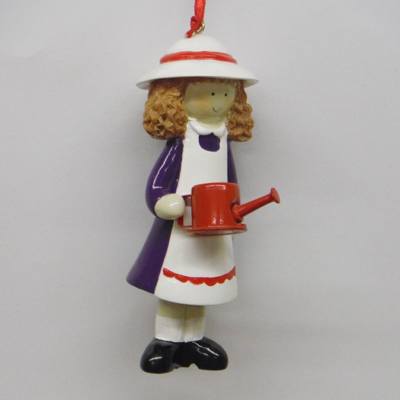 THIS CHRISTMAS ORNAMENT IS A GIRL WEARING A PURPLE DRESS AND TAN GARDENING HAT AND HOLDING A RED WATERING CAN. MEASURING 4.75" X 2" AND IS MADE OF RESIN.
