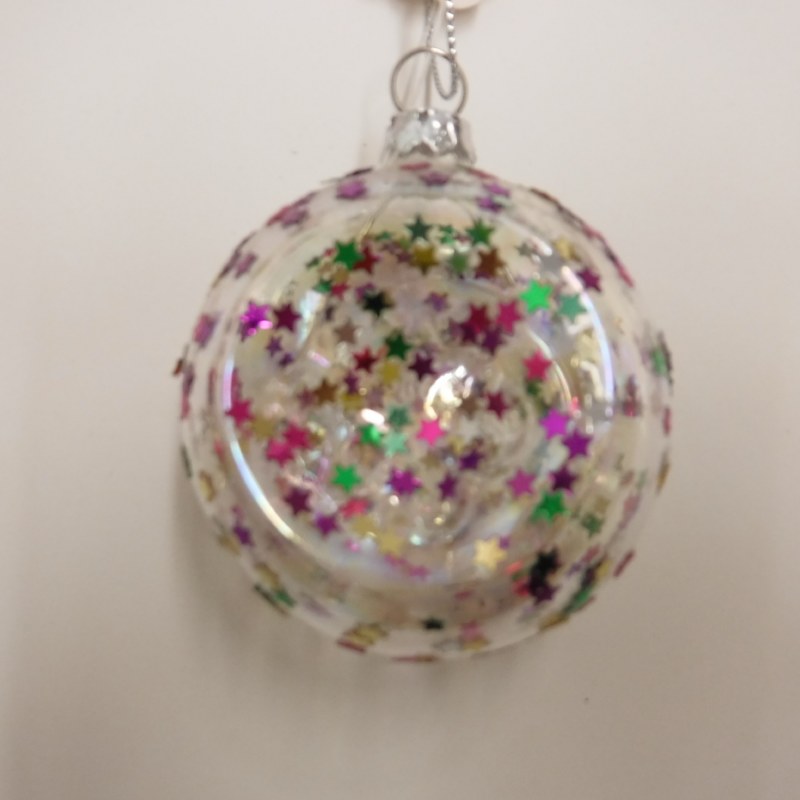 THIS CHRISTMAS ORNAMENT IS MADE OF GLASS. IT MEASURES APPROX. 2" IN DIAM. AND INDENTED ON TWO SIDES