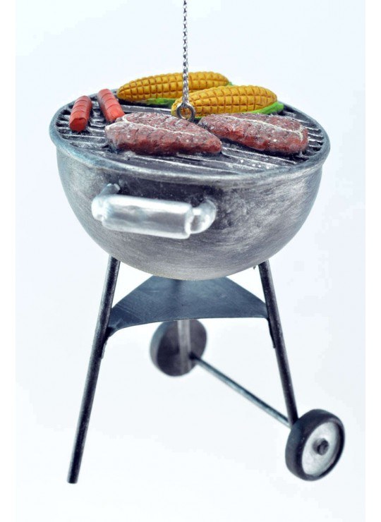 THIS CHRISTMAS ORNAMENT IS MADE OF RESIN AND MEASURES APPROX 4" X 2" . THIS ORNAMENT IS A GRILL WITH STEAK, CORN, AND HOT DOGS.