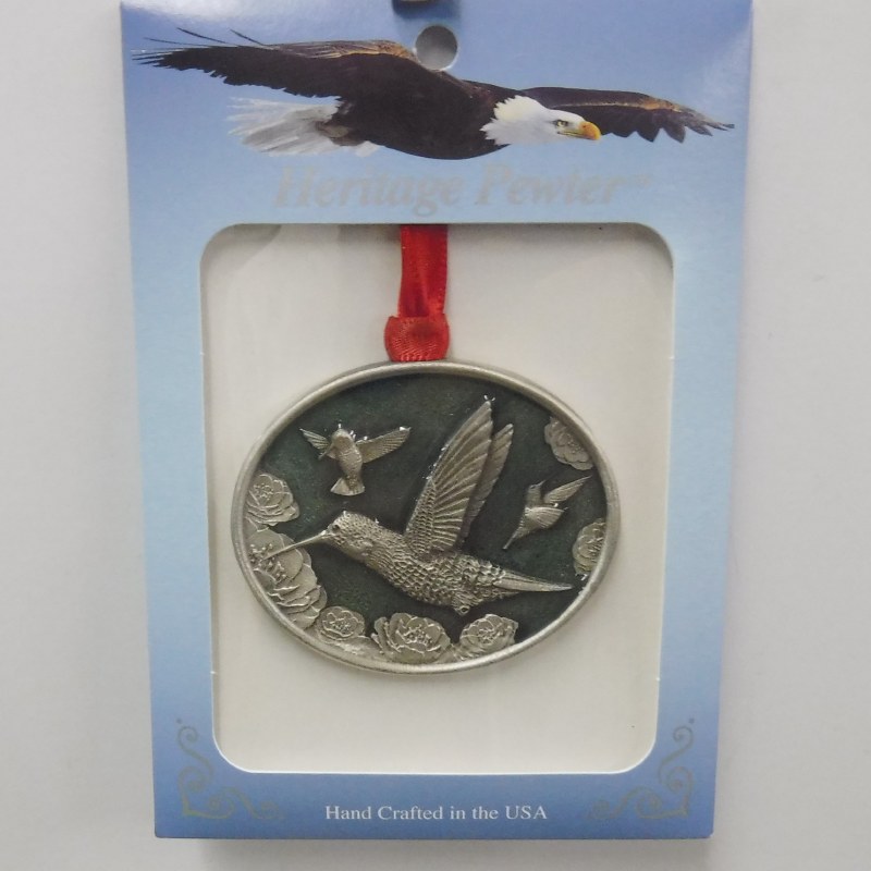THIS CHRISTMAS ORNAMENT WAS HAND CRAFTED IN THE US AND IS A HERITAGE PEWTER ORNAMENT. THE ORNAMENT IS APPROX 2" X 2" AND IS AN OVAL WITH A GREEN BACKGROUND WITH SILVER HUMMING BIRDS ON IT.