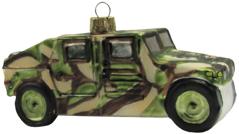 THIS CHRISTMAS ORNAMENT IS OF A CAMO COVERED HUMVEE ARMED FORCES VEHICAL THAT MEASURES APPROX. 2.5" X 5". GLASS Located in the Christmas Shoppe in room D, on a wall - board number 457 Printed maps are available to assist in finding it.
