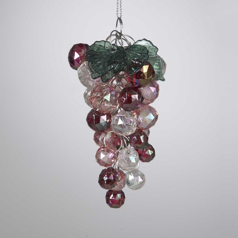 THIS CHRISTMAS ORNAMENT IS A BUNCH OF WHITE AND PURPLE IRRIDESCENT BEAD GRAPES HELD TOGETHER WITH WIRE RINGS. MEASURING 4" X 2", THESE GRAPES ARE MADE OF ACRYLIC
