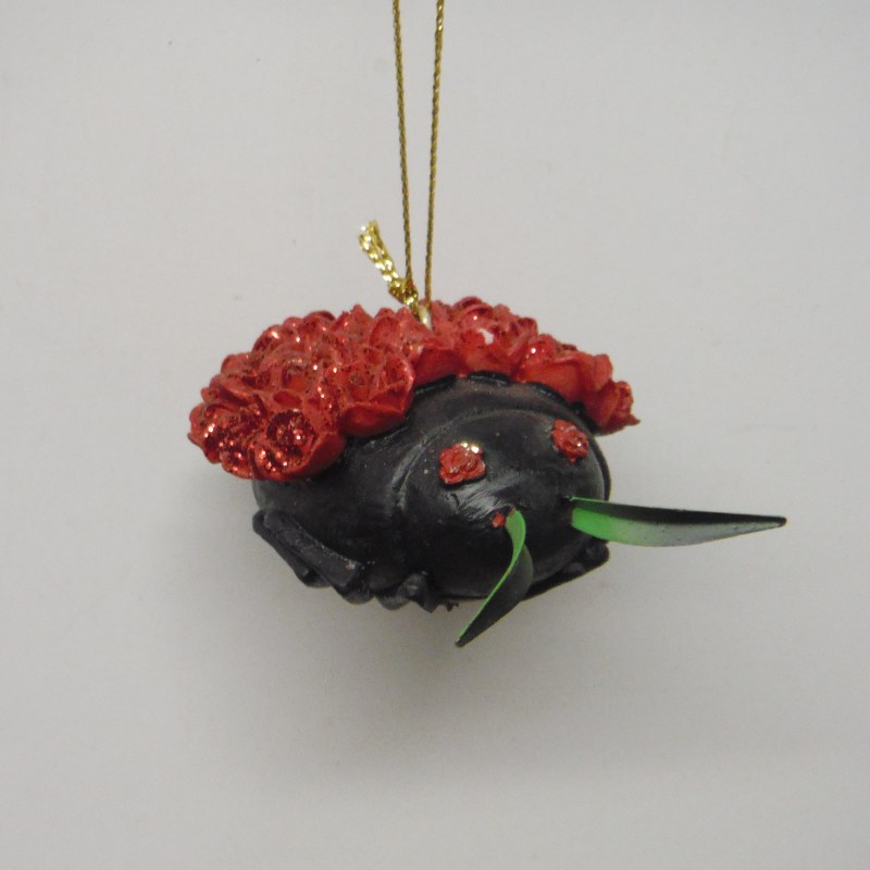 THIS CHRISTMAS ORNAMENT IS MADE OF RESIN AND MEASURES APPROX. 1.25" X 3". IT IS OF A LADY BUG. (THE RED ON THE BACK AND EYES ARE MADE OF GLITTERY ROSES.