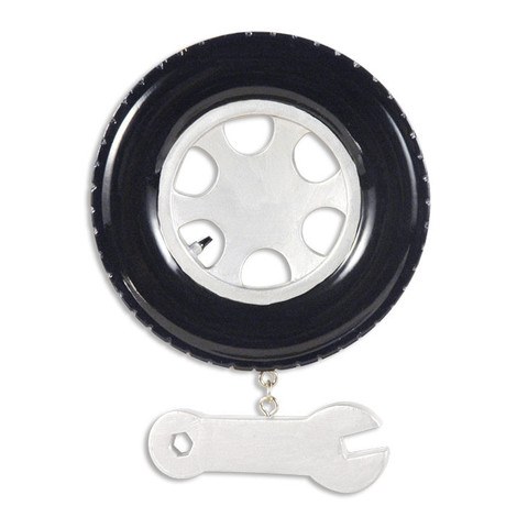 THIS CHRISTMAS ORNAMENT IS OF A BLACK CAR TIRE WITH A SILVER WRENCH HUNG FROM IT. MEASURES APPROX. 4" X 3" AND IS MADE OF RESIN.