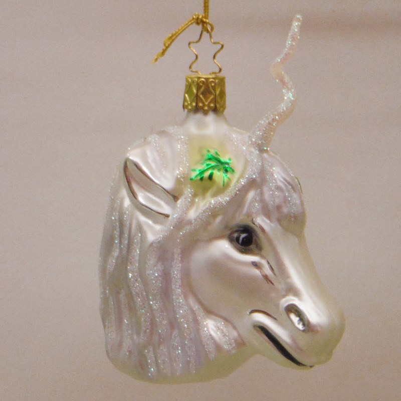 THIS CHRISTMAS ORNAMENT IS MADE BY INGE-GLAS AND IS OF A UNICORN. STANDS AT 4.5" TALL.
