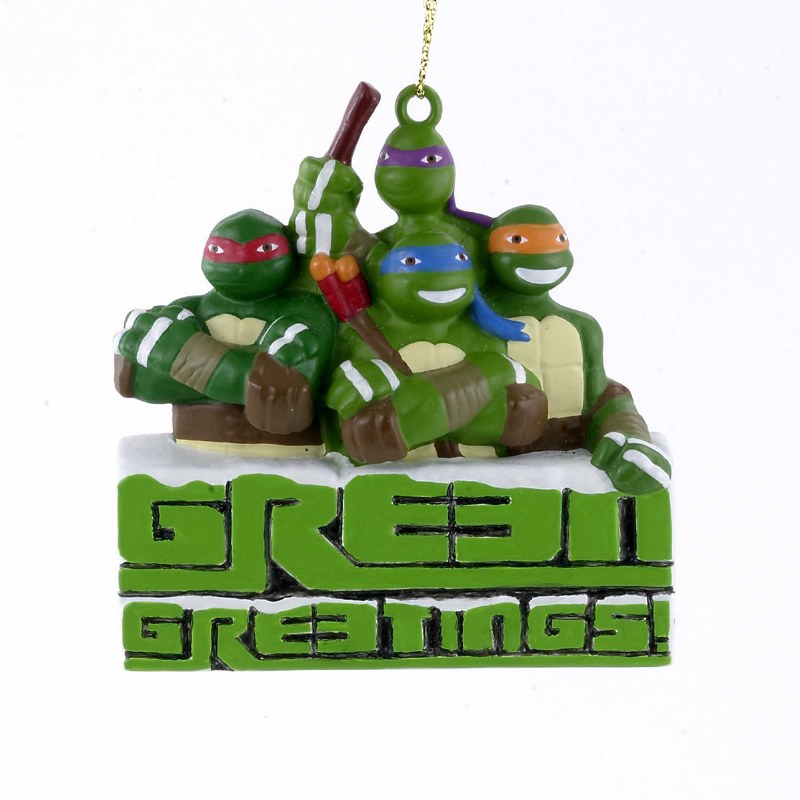 THIS CHRISTMAS ORNAMENT IS MADE OF RESIN AND MEASURES APPROX. 3.5" AND IS GREEN GREETINGS NINJA TURTLES.