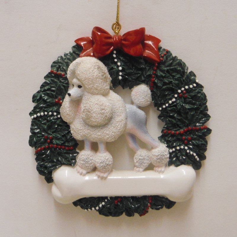 THIS CHRISTMAS ORNAMENT IS MADE OF RESIN AND MEASURES APPROX. 4". A POODLE IN A WREATH IS GREAT FOR ANY PET LOVER AND IS ALSO PERSONALIZABLE.