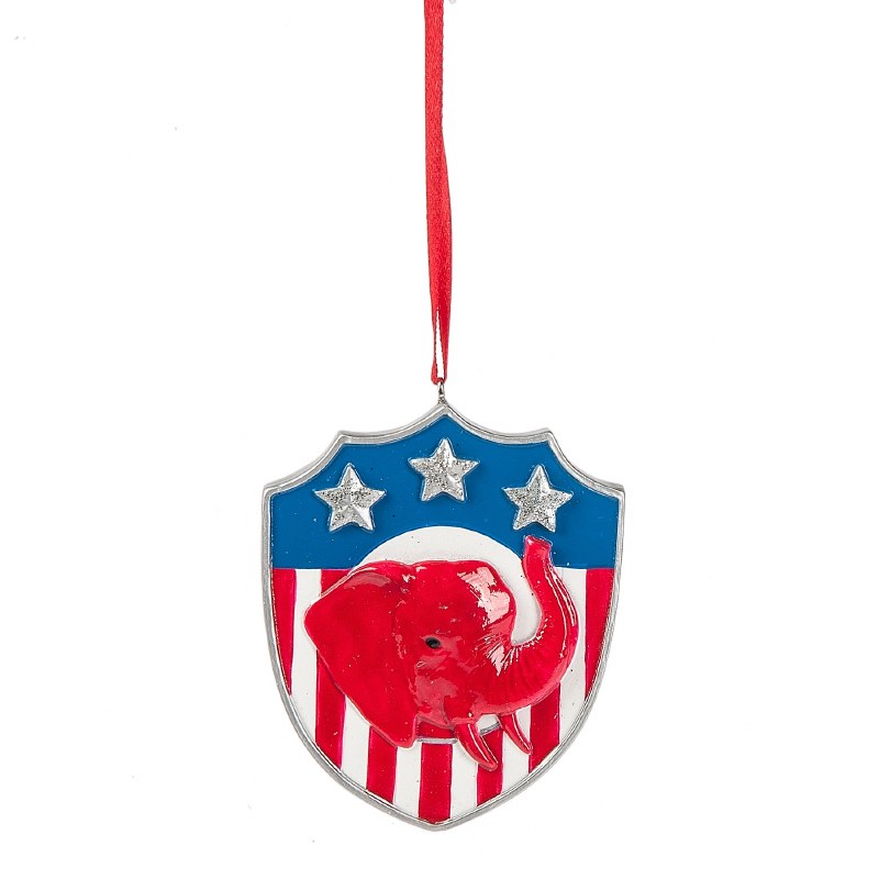 THIS FLAT CHRISTMAS ORNAMENT IS A BADGE WITH AN AMERICAN FLAG PRINT ON IT WITH A RED REPUBLICAN ELEPHANT HEAD IN THE MIDDLE. MEASURES APPROX. 3" X 2.5" AND IS MADE OF PLASTIC