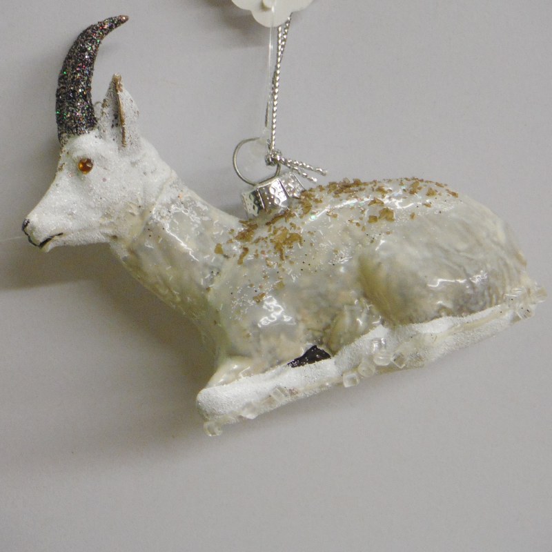 THIS CHRISTMAS ORNAMENT IS MADE OF GLASS AND MEASURES APPROX 3.5" X 3.75" AND IS OF A RESPITE RAM. Located in the Christmas Shoppe in room B, on a wall - board number 105 Printed maps are available to assist in finding it.