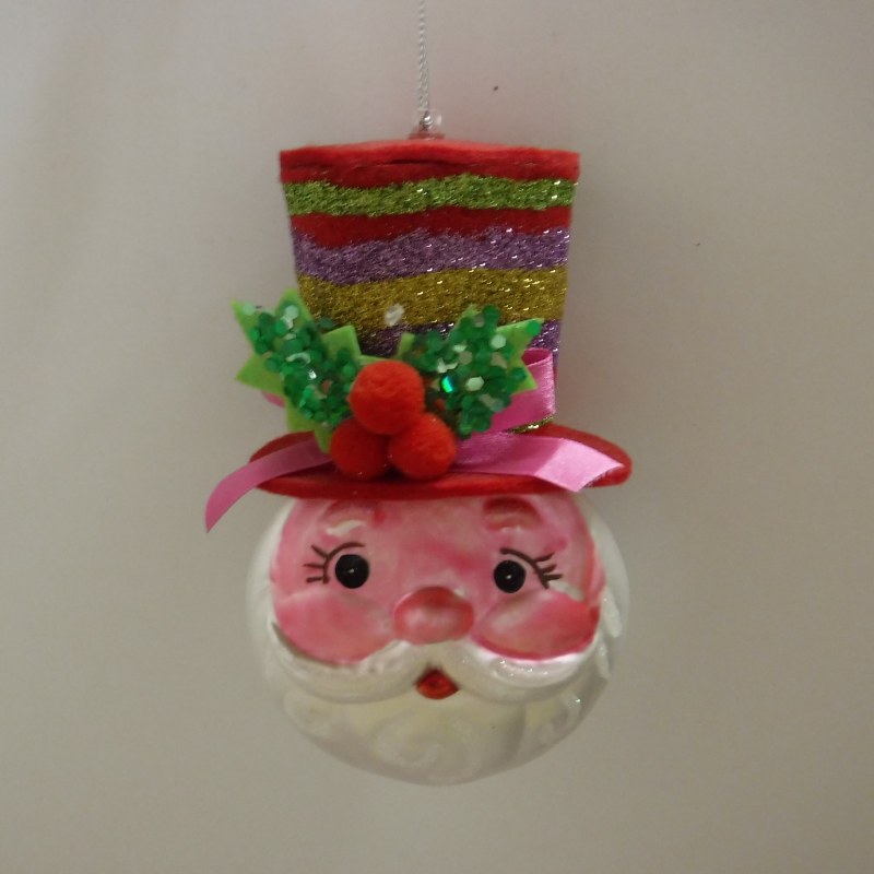 THIS CHRISTMAS ORNAMENT IS MADE OF GLASS AND MEASURES APPROX 6" X 3". THIS ORNAMENT IS OF SANTA'S HEAD WITH TOP HAT.