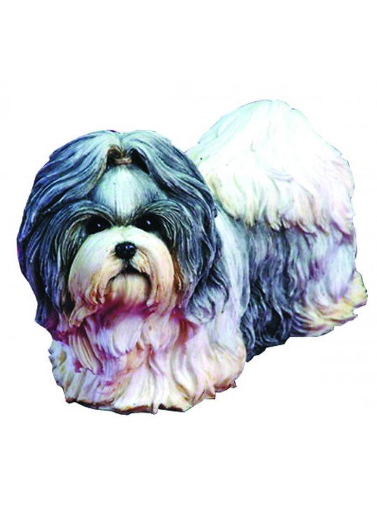THIS CHRISTMAS ORNAMENT IS MADE OF RESIN AND IS OF A WHITE AND GREY SHIH TZU. MEASURES APPROX. 2.5" X 3"