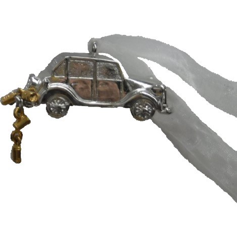 THIS CHRISTMAS ORNAMENT IS A SILVER CAR THAT HAS CANS DRAGGING BEHIND THE CAR. MEASURING 1" X 3" IT IS MADE OF METAL.
