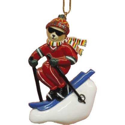 THIS CHRISTMAS ORNAMENT IS A BEAR WEARING A RED JACKET AND HAT RIDING ON A PAIR OF BLUE SKIES. THIS ORNAMENT IS ABLE TO BE PERSONALIZED. MEASURING 4" X 2.75"