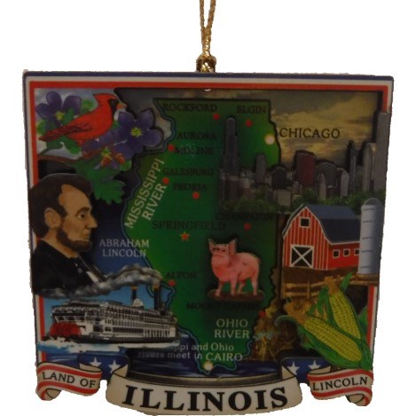 THIS CHRISTMAS ORNAMENT IS OF THE STATE OF ILLINOIS AND IS MADE OF FIBERBOAED. IT MEASURES APPROX. 2 1/2"X 2 1/2".