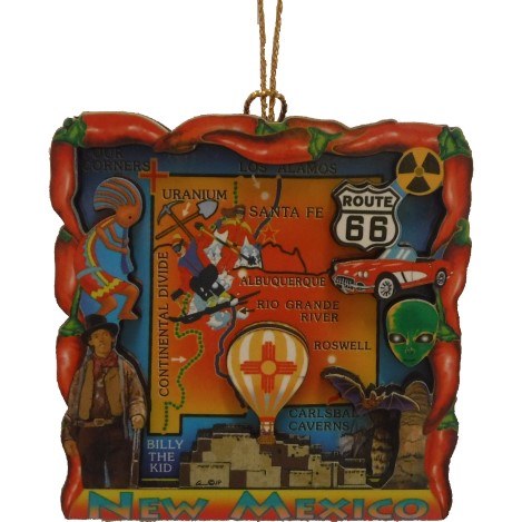THIS CHRISTMAS ORNAMENT IS THE STATE OF NEW MEXICO AND IS MADE OF FIBERBOARD. IT MEASURES APPROX. 2 1/2"X 2 1/2".
