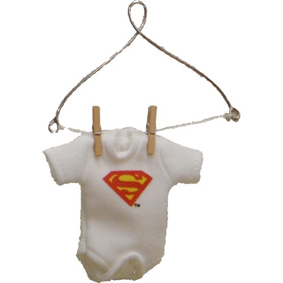 THIS CHRISTMAS ORNAMENT IS FROM THE CARTOON AND MOVIE SUPERMAN. PARTICULAR ITEM IS OF A SUPERMAN BABY ONESIE HANGING OFF A CLOSE HANGER. STANDS AT 4.5" X 3"
