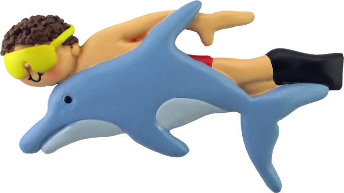 THIS CHRISTMAS ORNAMENT IS OF A BROWN HAIRED MALE SWIMMIMG WITH A DOLPHIN. ITEM IS APPROX 2" X 4" AND IS MADE OF POLYRESIN.