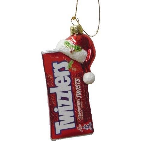 THIS CHRISTMAS ORNAMENT IS MADE OF GLASS AND MEASURES APPROX. 5" X 2.75" IT IS A PACK OF STRAWBERRY TWIZZLERS.