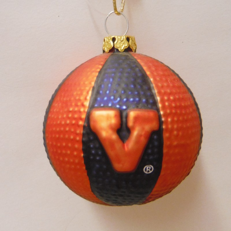 THIS CHRISTMAS ORNAMENT IS MADE OF GLASS AND MEASURES APPROX. 2.5" AROUND AND IS OF A VIRGINIA UNIVERSITY BASKETBALL.