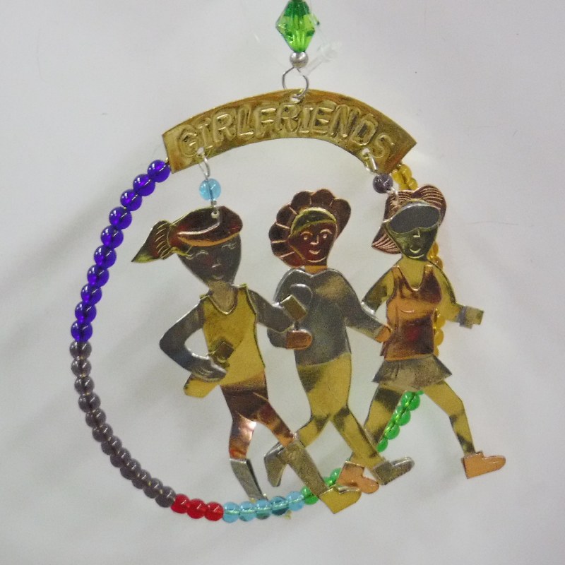 THIS CHRISTMAS ORNAMENT IS MADE OF ASSORTED METALS AND IS HAND MADE. IT MEASURES APPROX. 4" X 3.5" AND IS OF 3 GIRLS WALKING IT CALLED WORKOUT "GIRLFRIENDS".