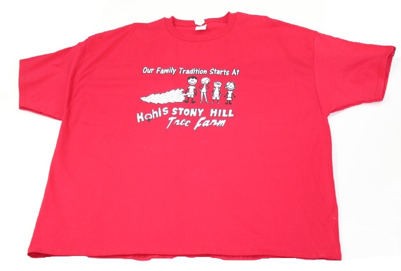 THIS T-SHIRT IS OF AN ADULT 3XL WITH OUR WHITE DECAL THAT SAYS " OUR FAMILY TRADITION STARTS AT KOHLS STONY HILL TREE FARM". ALSO FEATURES A FAMILY OF FOUR DRAGGING A TREE. WE WILL CALL WITH COLOR OPTION AS THE DO VARY AT THE TIME OF PURCHASE.