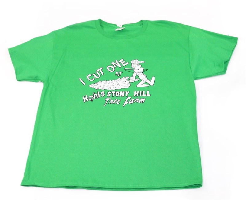 THIS T-SHIRT IS OF AN ADULT LARGE WITH OUR WHITE DECAL THAT SAYS " I CUT ONE AT KOHLS STONY HILL TREE FARM". ALSO FEATURES A ADULT DRAGGING A TREE WITH A SAW. WE WILL CALL WITH COLOR OPTION AS THE DO VARY AT THE TIME OF PURCHASE.