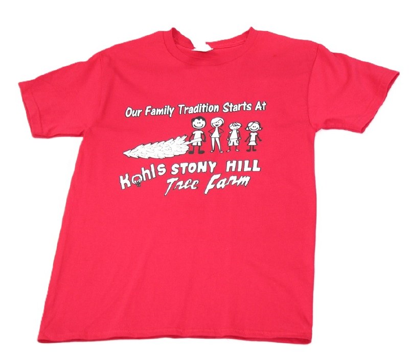 THIS T-SHIRT IS OF AN ADULT SMALL WITH OUR WHITE DECAL THAT SAYS " OUR FAMILY TRADITION STARTS AT KOHLS STONY HILL TREE FARM". ALSO FEATURES A FAMILY OF FOUR DRAGGING A TREE. WE WILL CALL WITH COLOR OPTION AS THE DO VARY AT THE TIME OF PURCHASE.