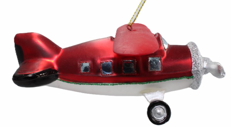 THIS CHRISTMAS ORNAMENT IS MADE OF GLASS IS RED WITH SILVER ON BOTTOM AND BLACK WHEELS AND MEASURES APPROX. 4" X 4.5 X 2.25". IT A PASSENGER PLANE.