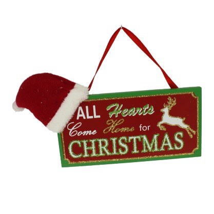 THIS CHRISTMAS ORNAMENT IS MADE OF WOOD AND MEASURES APPROX. 2.5" X 6.5". WOODEN SIGN WITH A SANTA HAT ON LEFT CORNER. "ALL HEARTS COME HOME FOR CHRISTMAS".