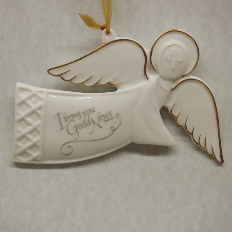 THIS CHRISTMAS ORNAMENT IS A PORCELIN ANGEL, HAS WRITTEN ON IT " I BRING YOU GOOD NEWS". ITEM IS APPROX 3" X 4.5"