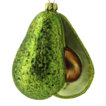 THIS ORNAMENT IS OF A AVOCADO THAT IS MADE OF GLASS IS GREEN WITH GLITTER AND BROWN PIT AND MEASURES APPROXIMATELY 3.75" X 2" X 4.75".