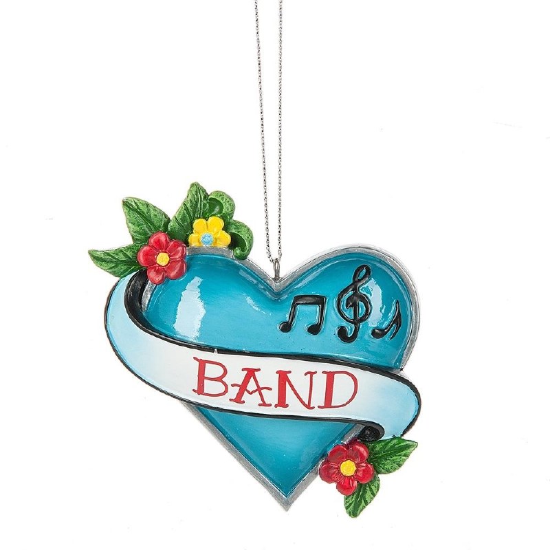 THIS CHRISTMAS ORNAMENT IS MADE OF RESIN AND MEASURES APPROX. 3.25' X 3.25" AND IS OF A HEART WITH BAND ON THE BANNER.