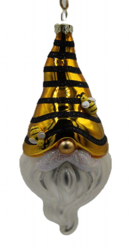 THIS CHRISTMAS ORNMENT IS OF A GNOME HEAD WITH A YELLOW GOLD AND BLACK BANDED GLITTER HAT WITH BEES ON IT. IT MEASURES APPROX. 2.5" X 2.5" X 6.5" AND IS MADE OF GLASS.