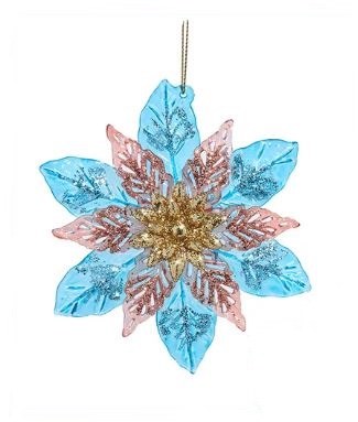 THIS CHRISTMAS ORNAMENT IS OF A FLOWER. IT'S MADE OF PLASTIC AND MEASURES APPROX 4.75" Located in the Christmas Shoppe in room C, on a wall - board number 304. Printed maps are available to assist in finding it.