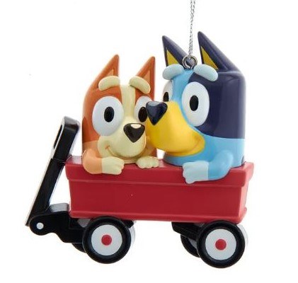 THIS CHRISTMAS ORNAMENT IS OF BLUEY AND BINGO IN A RED WAGON. IT MEASURES APPROX. 3" AND IS MADE OF RESIN. Located in the Christmas Shoppe in room F, on a wall - board number 741. Printed maps are available to assist in finding it.
