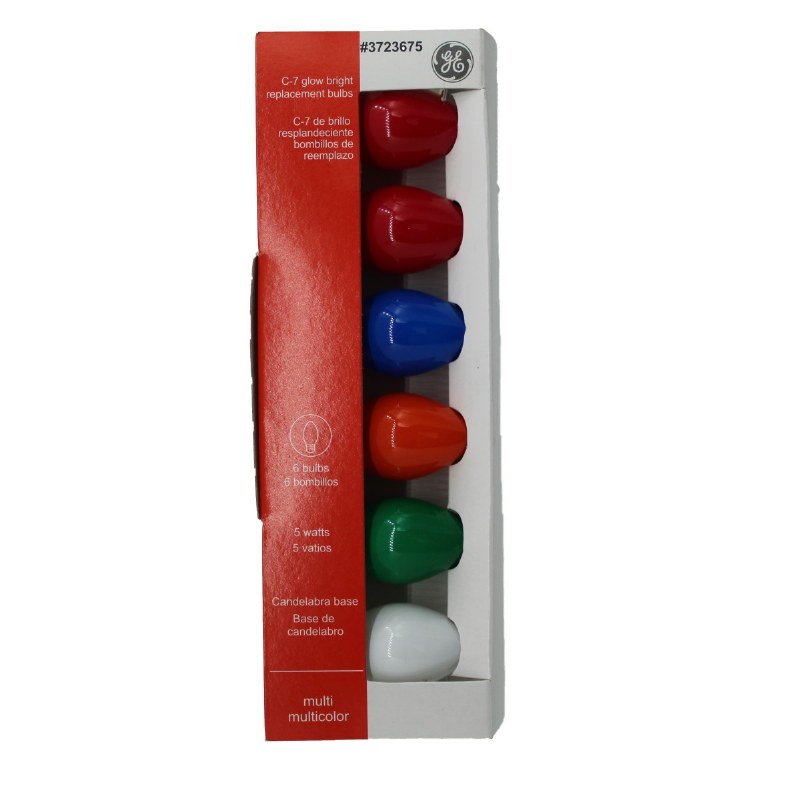 C7 CANDELABRA BASE 5 WATT MULTI COLOR REPLACEMENT BULBS 6 PACK. INDOOR/OUTDOOR USE.
