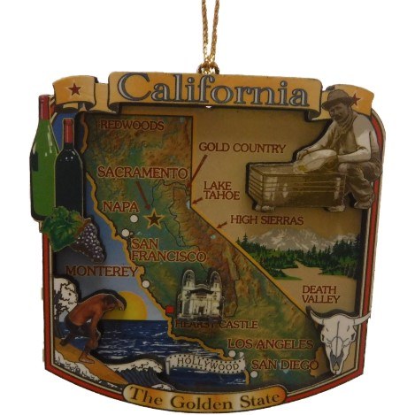 THIS CHRISTMAS ORNAMENT IS OF THE STATE OF CALIFORNIA AND IS MADE OF FIBERBOARD. IT MEASURES APPROX. 3"X 2 1/2".