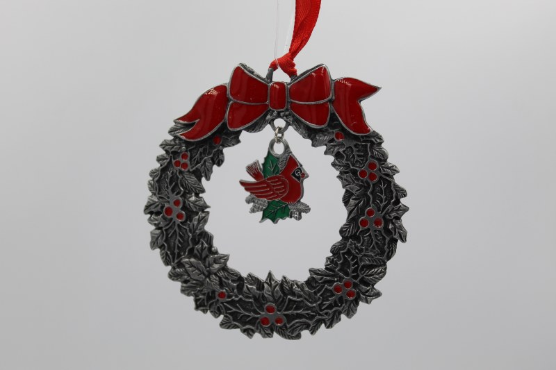 THIS HALLMARK CHRISTMAS ORNAMENT IS MADE OF METAL AND ACRYLIC. IT IS A SILVER WREATH WITH A RED BOE WITH A DANGLING RED CARDINAL IN THE MIDDLE. IT MEASURES APPROX. 2.75" X .125" X 3".